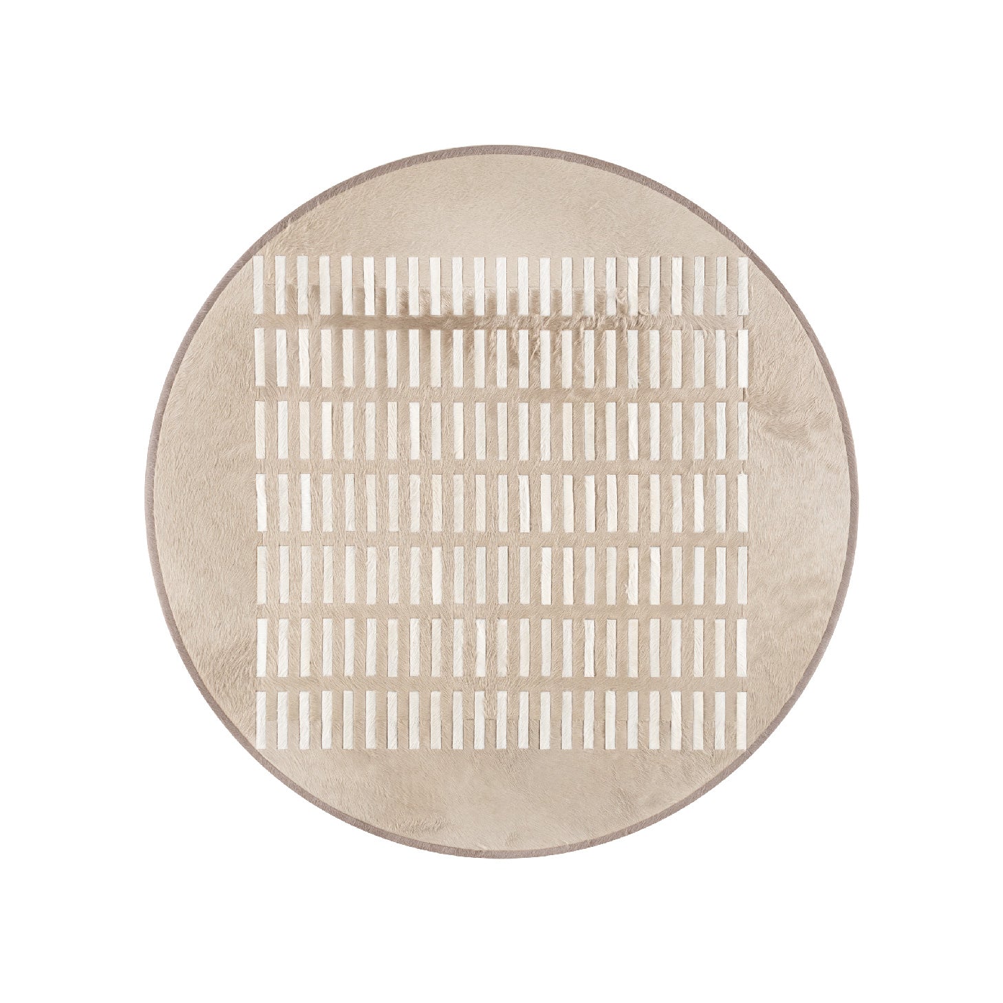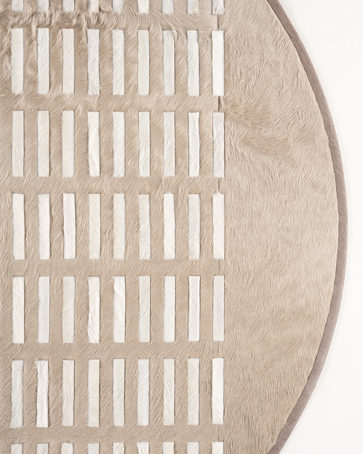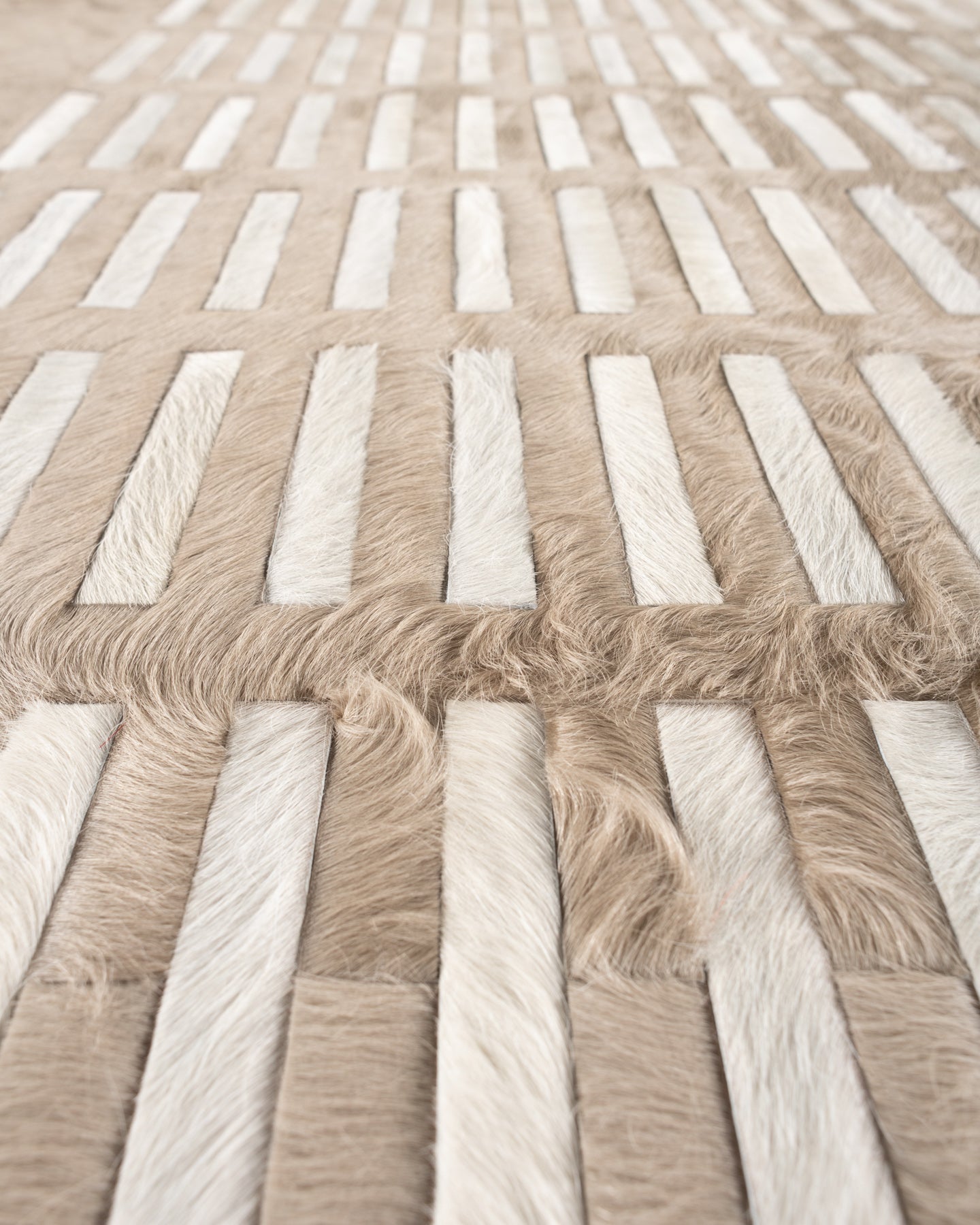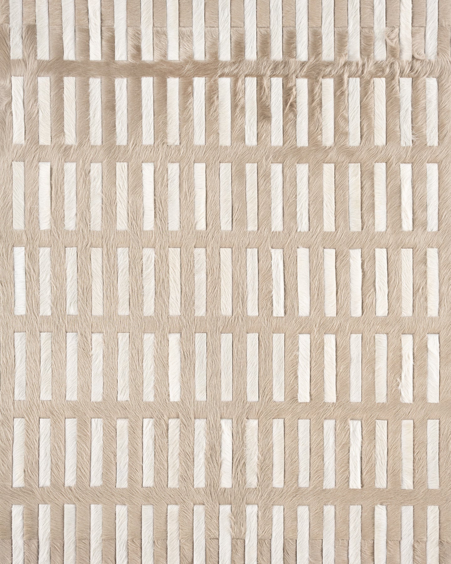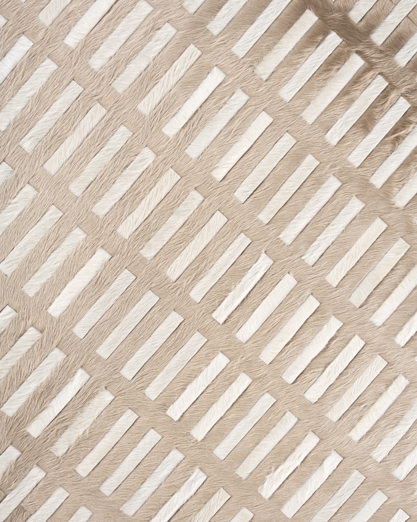 The Agnes Martin Rug series by Rottet Collection for Kyle Bunting pays homage to the Saskatchewan born, America Artists, Agnes Martin (1912-2004). Celebrated for her abstract paintings with organic forms, she became well known for her signature format featuring six by six foot painted canvases, covered from edge to edge with meticulously penciled grids. While the geometric boarders of each rug within the series may vary. her inspiration transpires through the interior configuration of hand cut natural hide strips intricately laid within a perfect grid.
