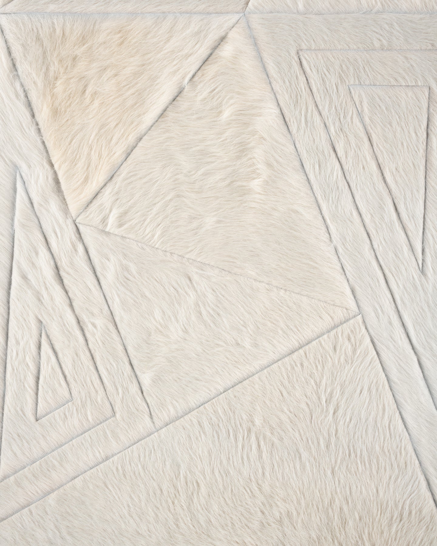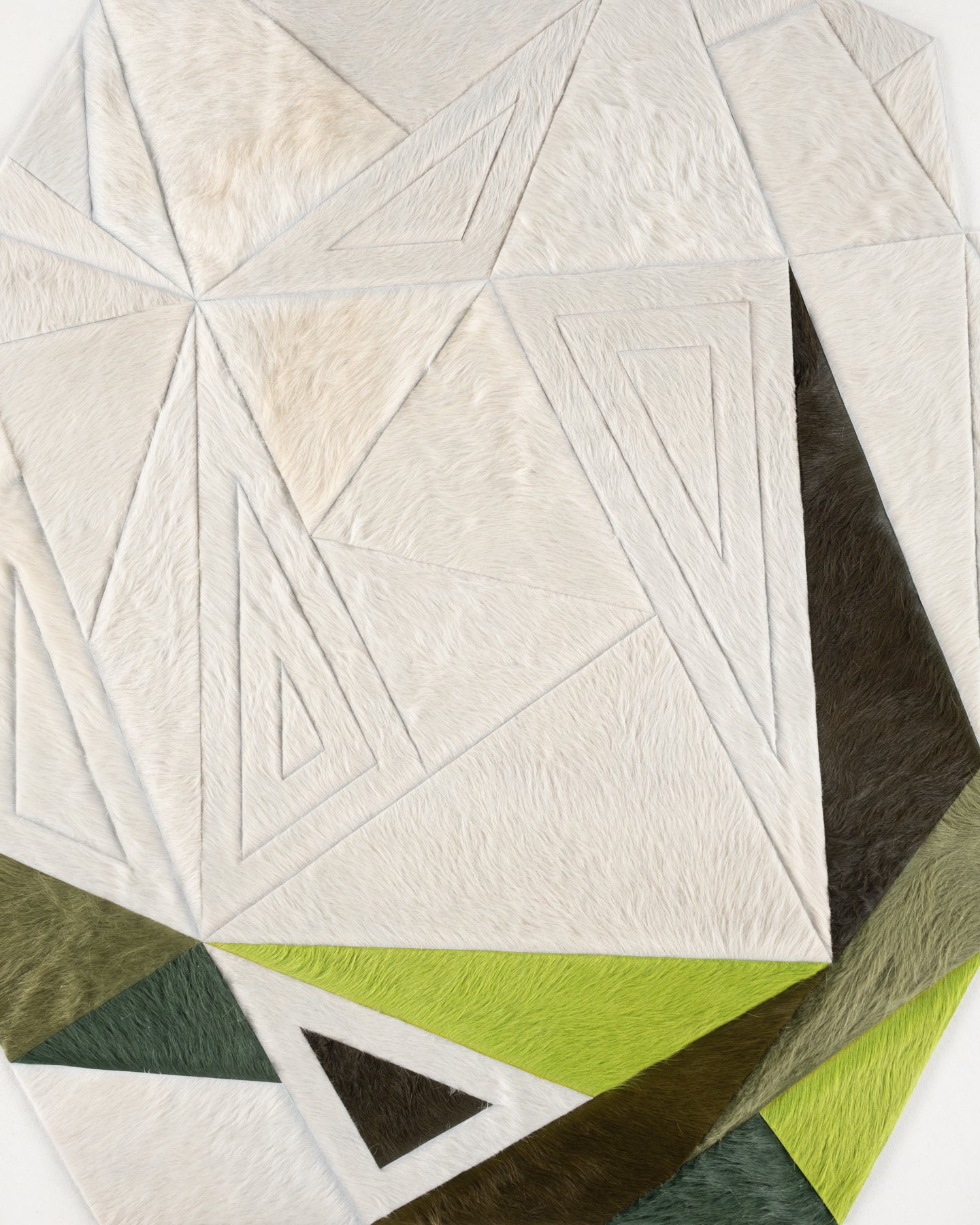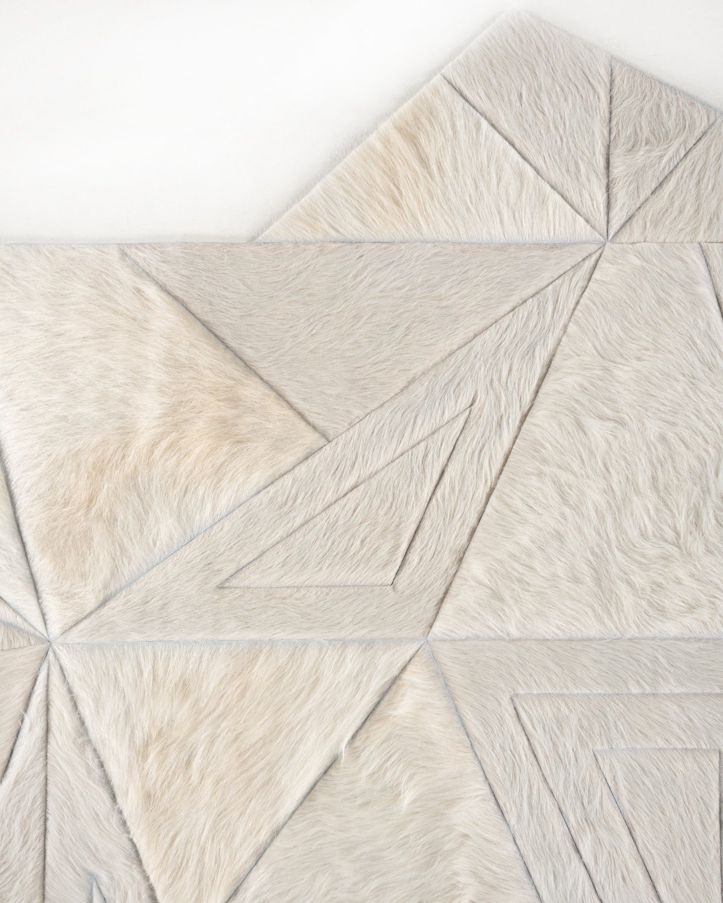 The Scutoid Rug by Rottet Collection for Kyle Bunting was inspired by the scientific discovery that epithelial cells naturally adopt very complex and beautiful, yet stable geometric shapes known as "scutoids", which consist of sheets of similar tissue bound closely together to form larger organic beings. Irregular geometric shapes are cut from natural hide and intricately assembled by hand to give the Scutoid Rug a life of its own.