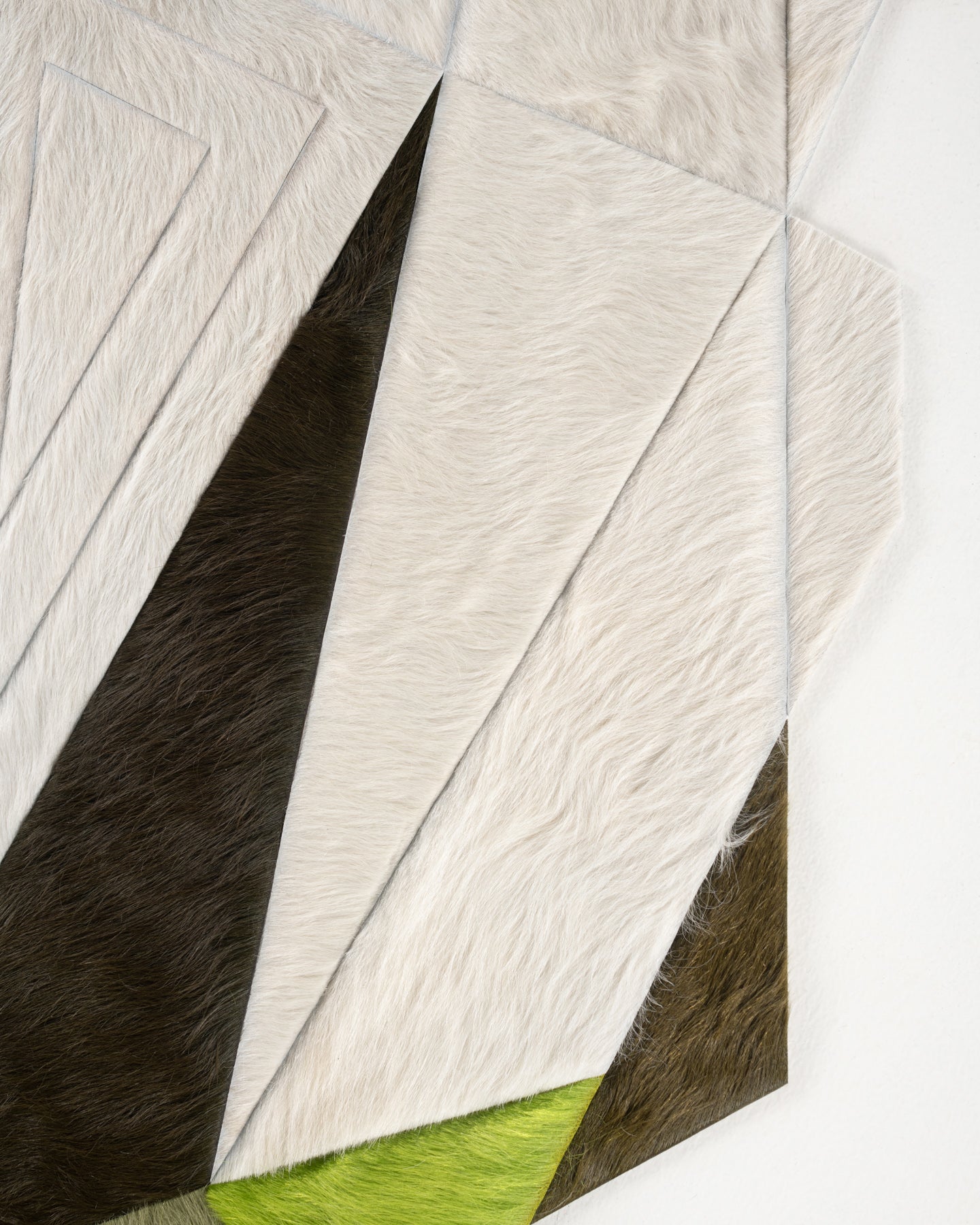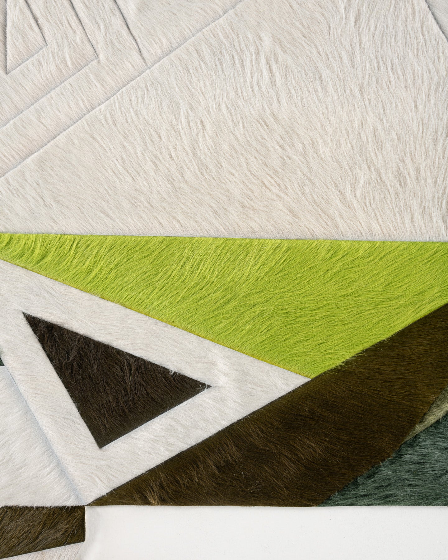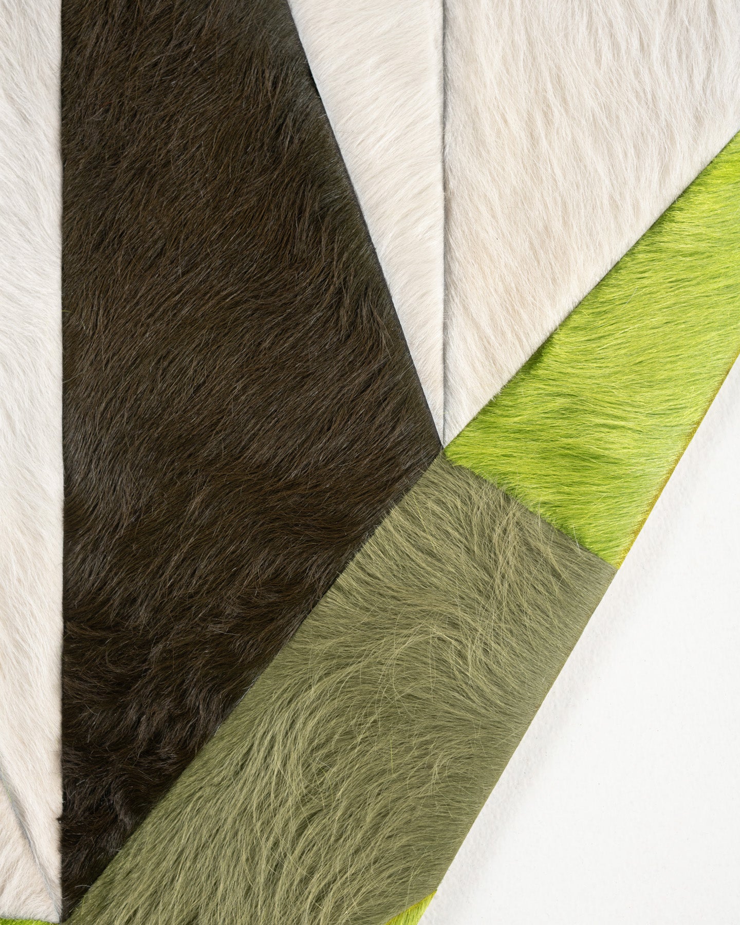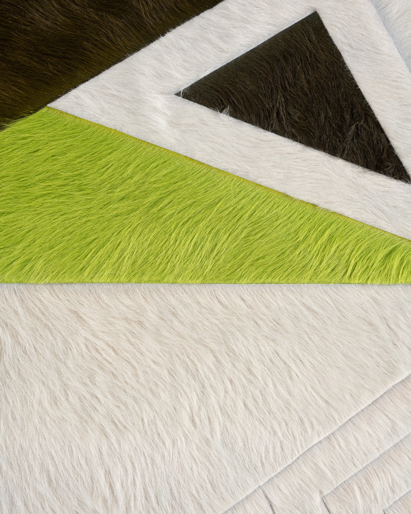 The Scutoid Rug by Rottet Collection for Kyle Bunting was inspired by the scientific discovery that epithelial cells naturally adopt very complex and beautiful, yet stable geometric shapes known as "scutoids", which consist of sheets of similar tissue bound closely together to form larger organic beings. Irregular geometric shapes are cut from natural hide and intricately assembled by hand to give the Scutoid Rug a life of its own.