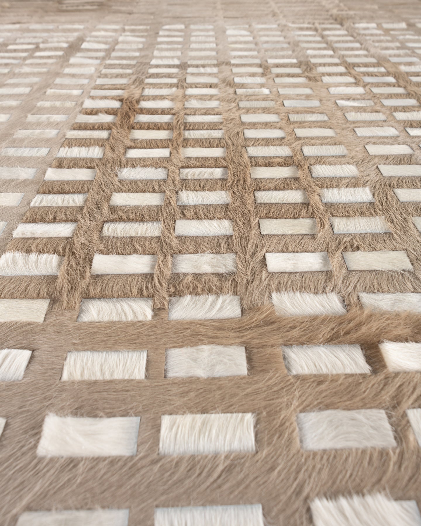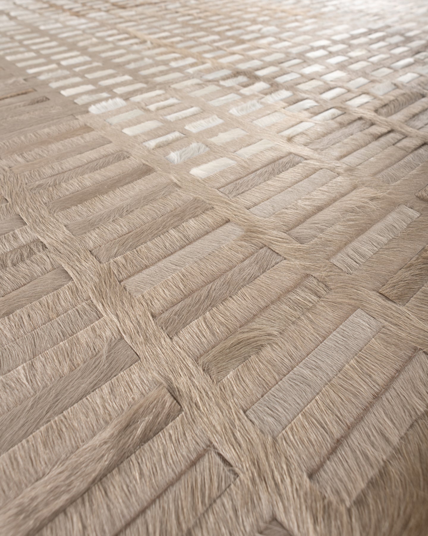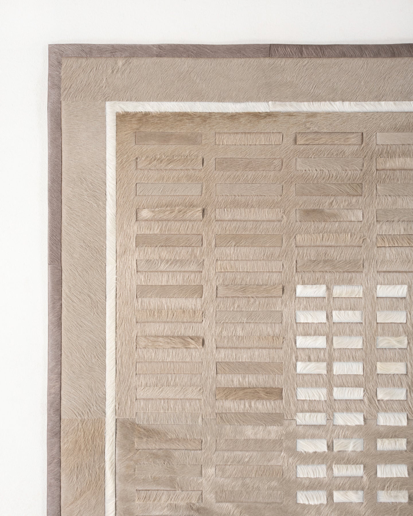 The Agnes Martin Rug series by Rottet Collection for Kyle Bunting pays homage to the Saskatchewan born, America Artists, Agnes Martin (1912-2004). Celebrated for her abstract paintings with organic forms, she became well known for her signature format featuring six by six foot painted canvases, covered from edge to edge with meticulously penciled grids. While the geometric boarders of each rug within the series may vary. her inspiration transpires through the interior configuration of hand cut natural hide strips intricately laid within a perfect grid.