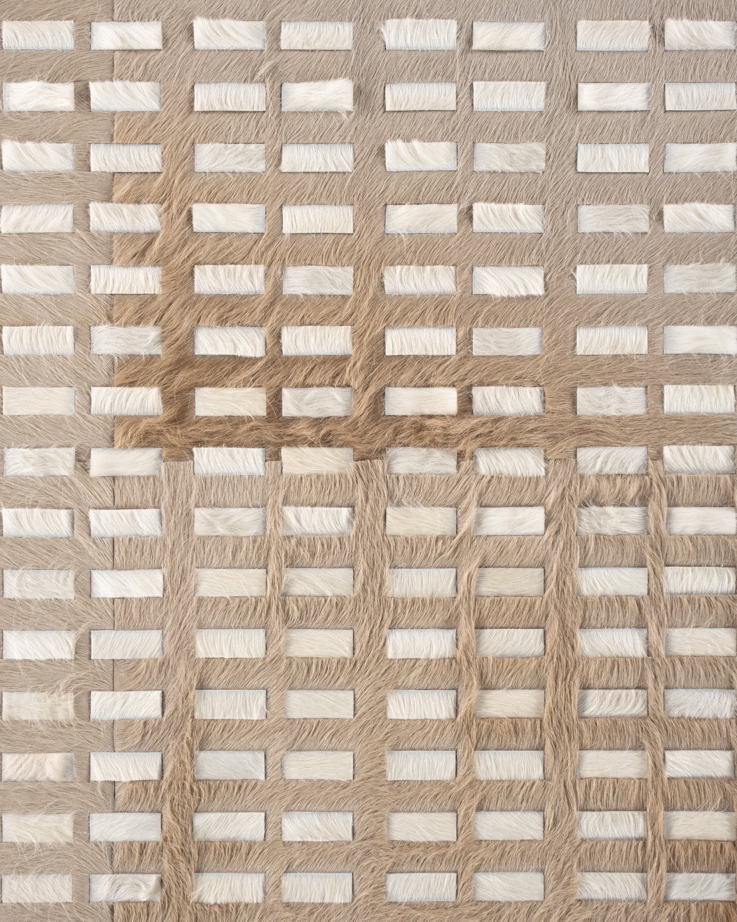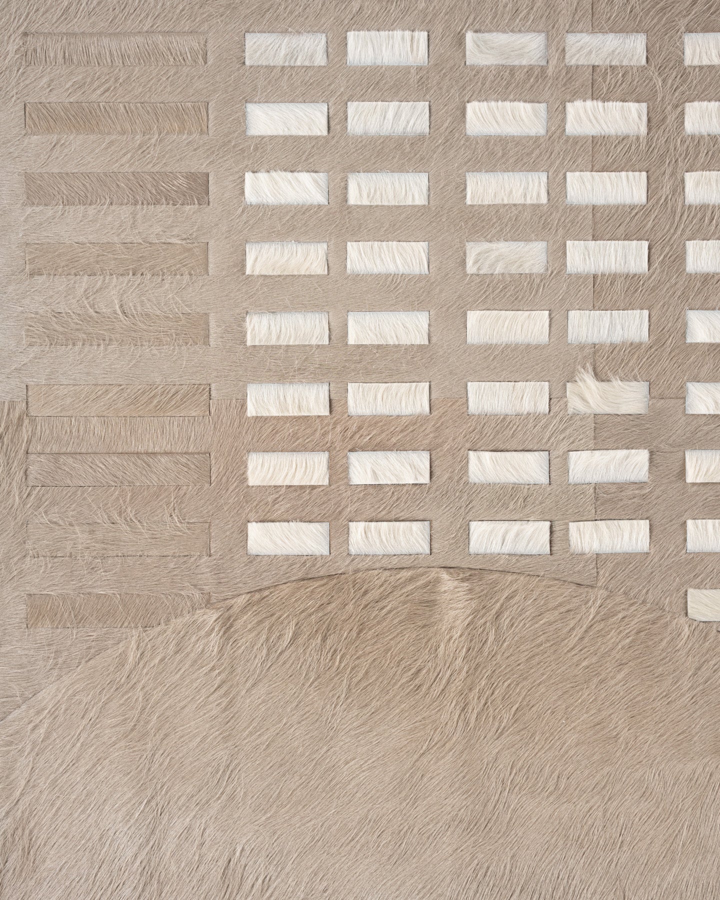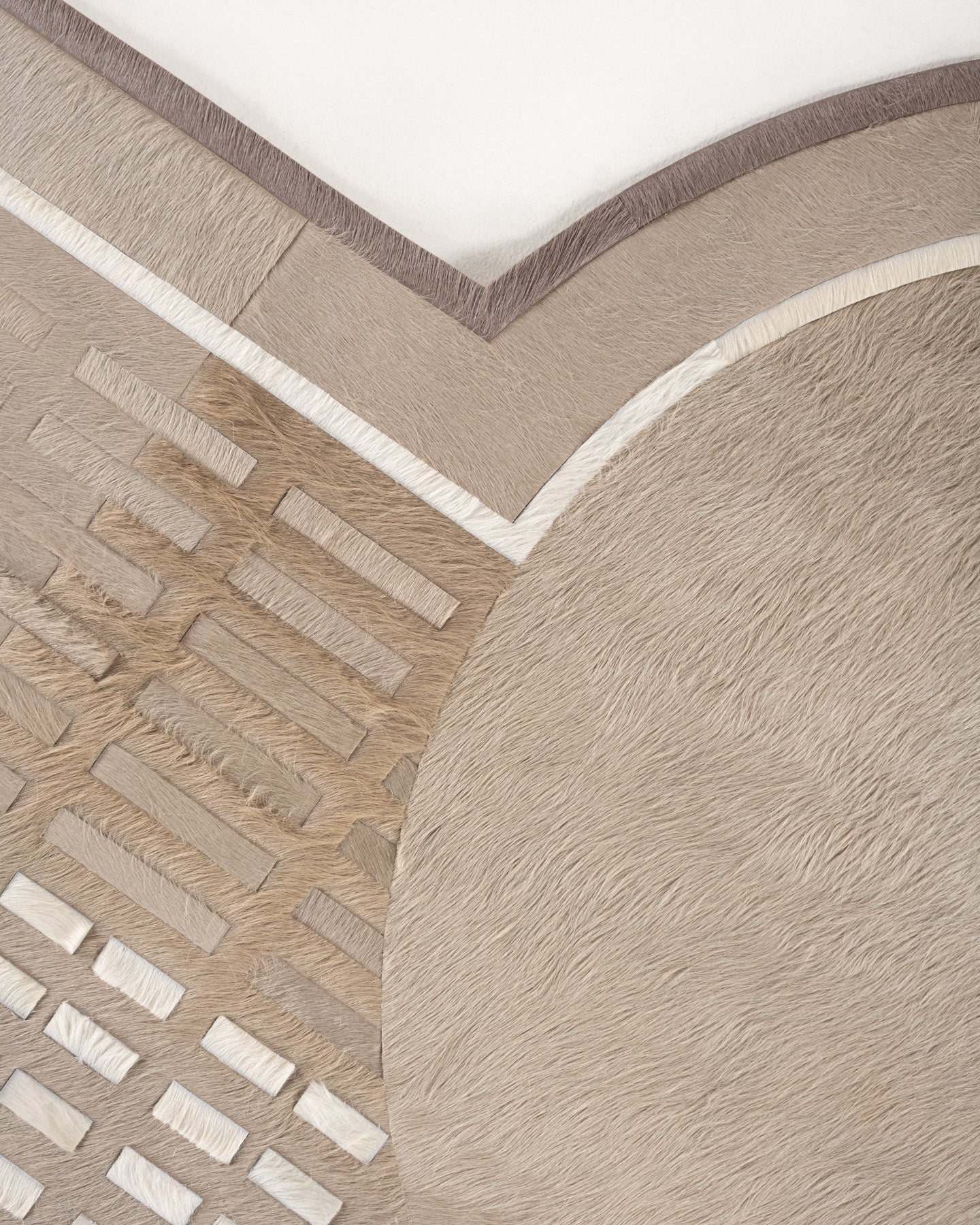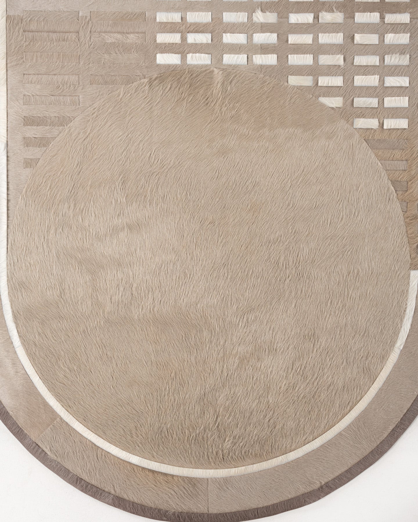 The Agnes Martin Rug series by Rottet Collection for Kyle Bunting pays homage to the Saskatchewan born, America Artists, Agnes Martin (1912-2004). Celebrated for her abstract paintings with organic forms, she became well known for her signature format featuring six by six foot painted canvases, covered from edge to edge with meticulously penciled grids. While the geometric boarders of each rug within the series may vary. her inspiration transpires through the interior configuration of hand cut natural hide strips intricately laid within a perfect grid.