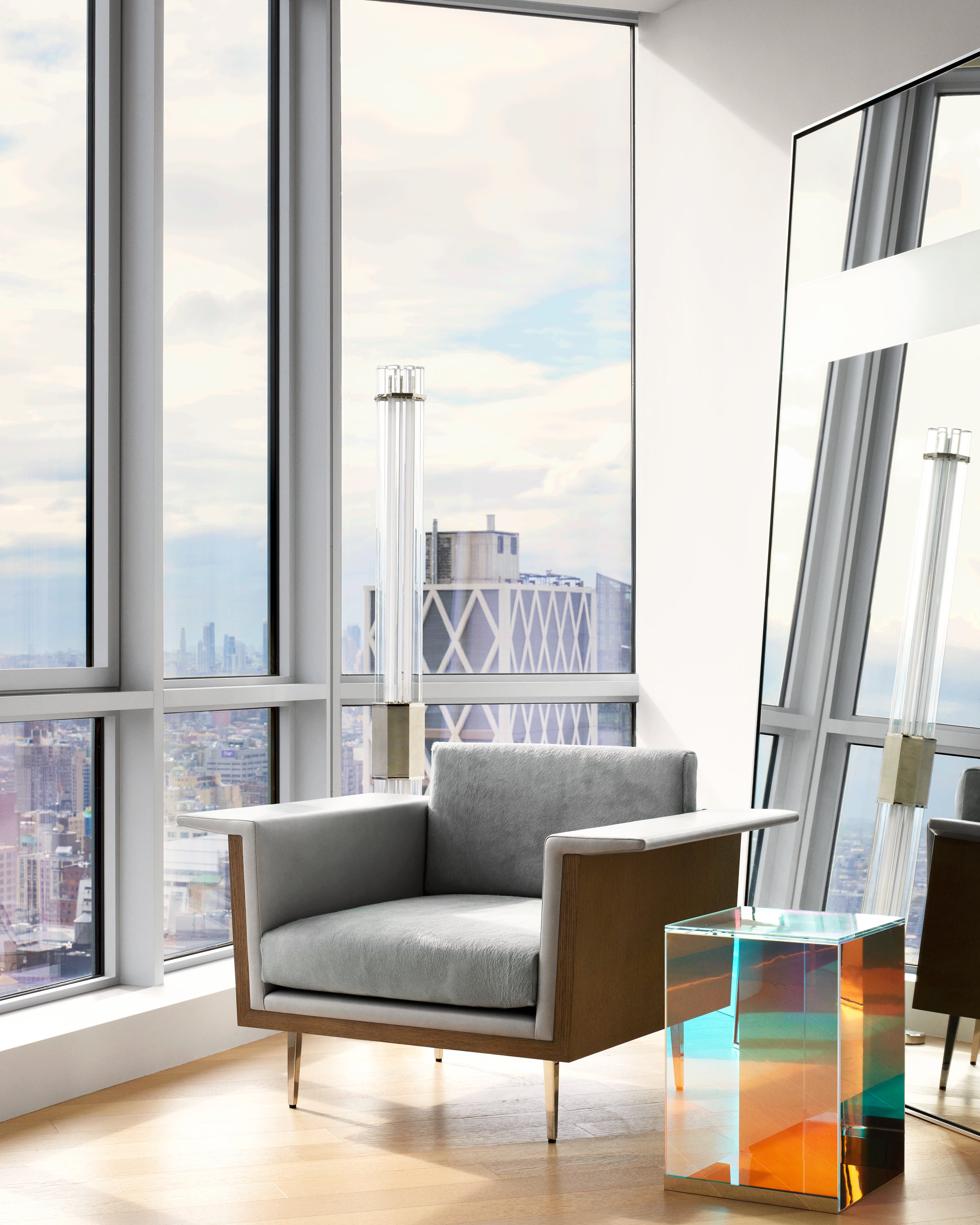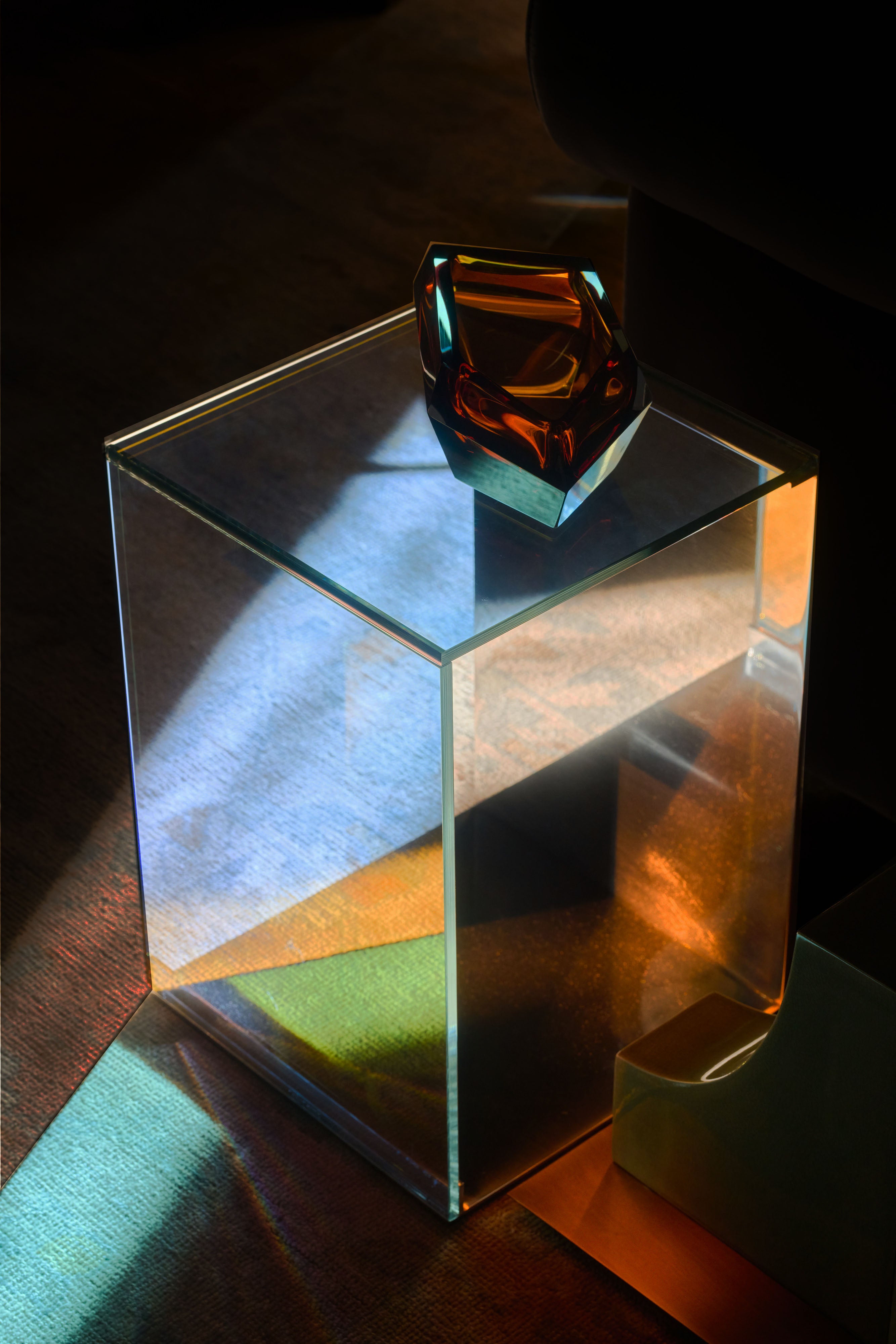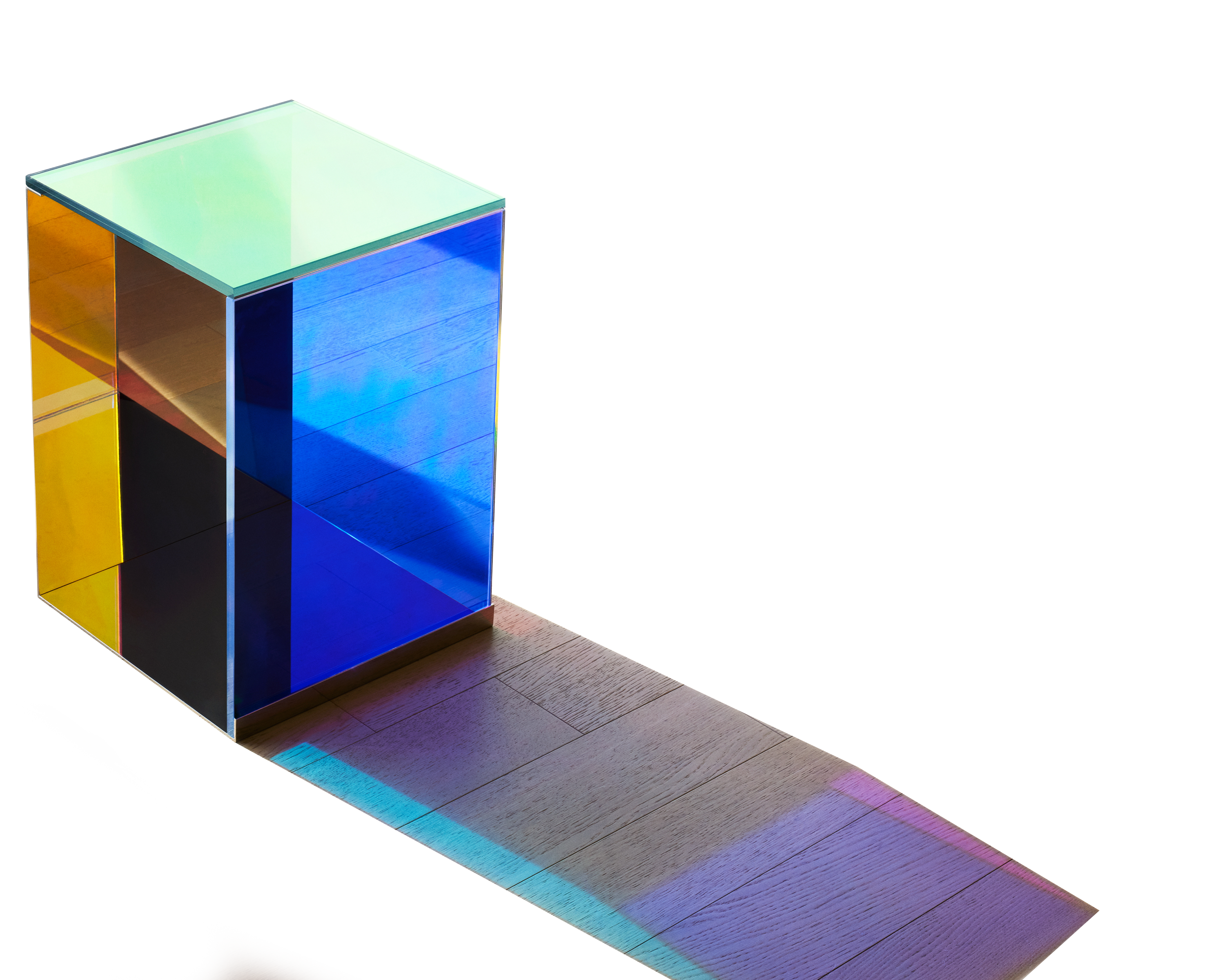 The award-winning Dichroic Table is an active statement piece that evolved from Lauren's fascination with early Light and Space artists. As natural light changes throughout the day, the surfaces of the table dramatically shift color, reflecting and refracting colored shadows that create a dialogue with its surrounding environment.